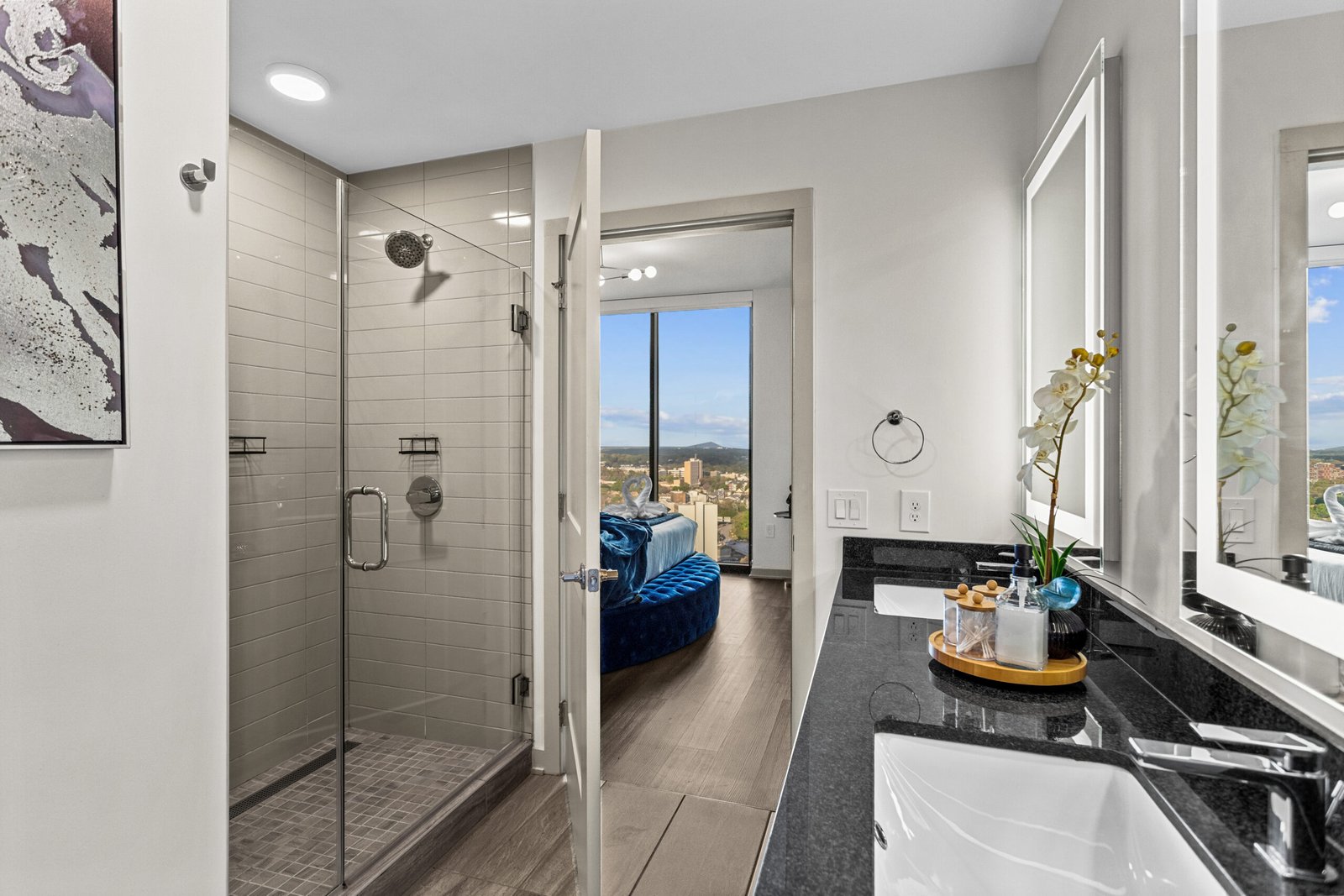 ✔ King Primary Suite – Plush king bed, skyline views, and spa-like en-suite bathroom with walk-in rain shower & soaking tub.