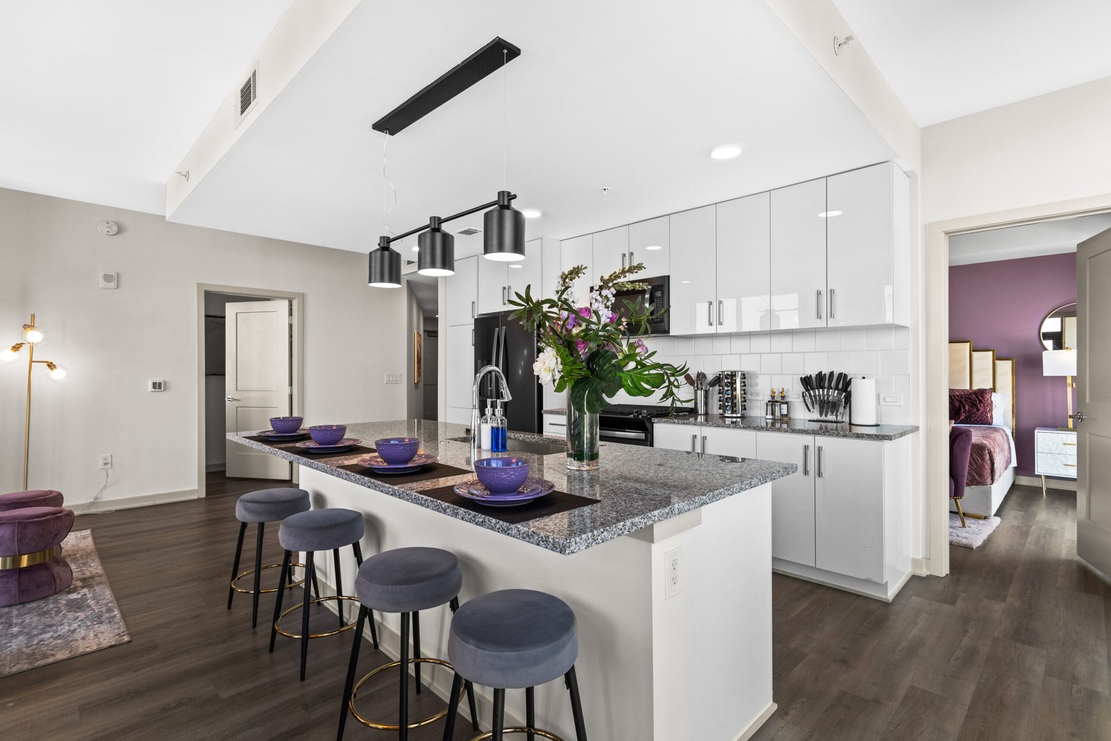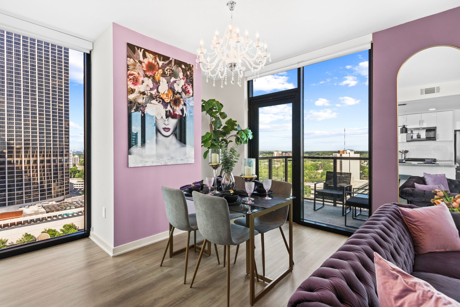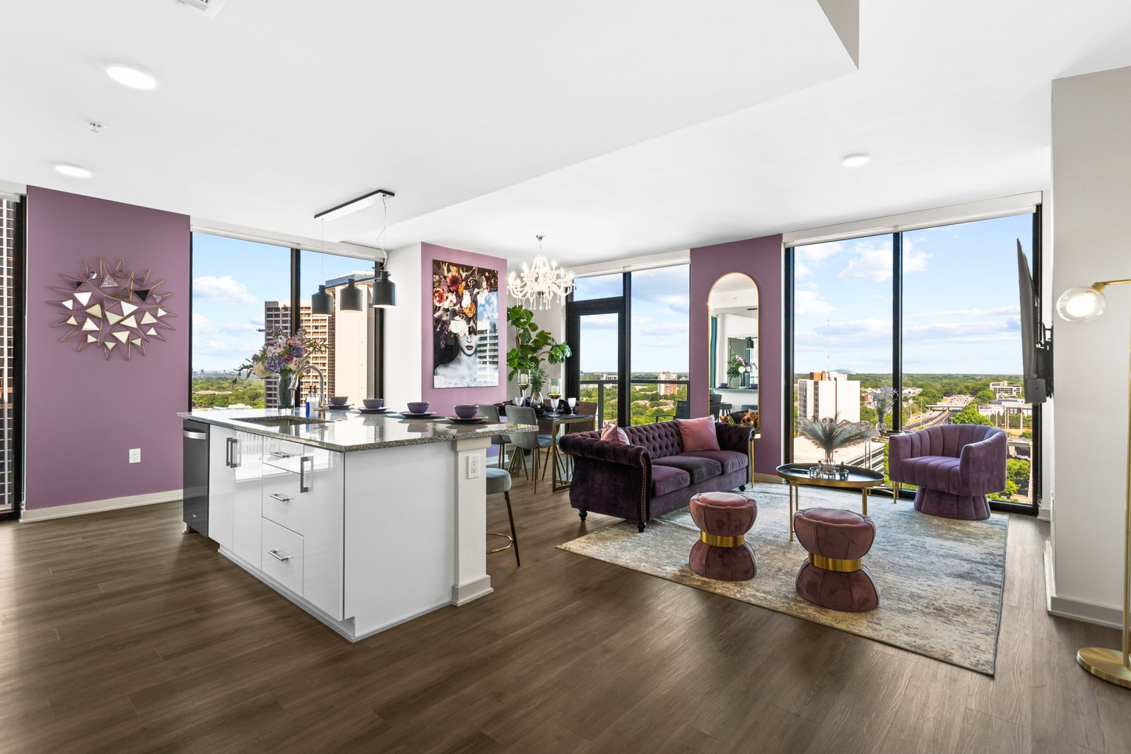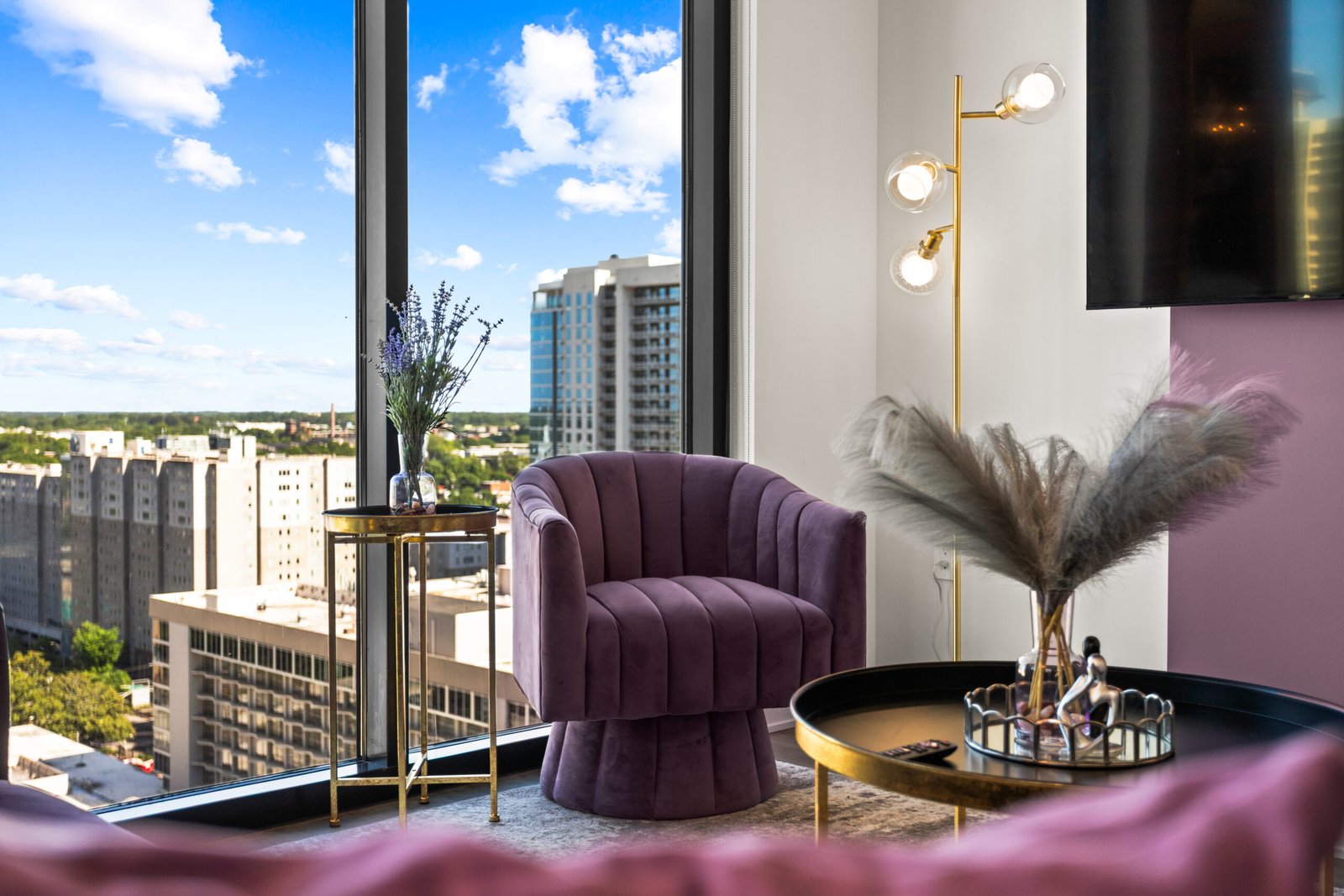 Welcome to The Velvet Room — a luxury 2BR/2BA high-rise where soft lavender tones, rich textures, and skyline views create a calm, elevated stay in the heart of downtown Atlanta. Designed for both short visits and extended stays, this space blends boutique-hotel style with everyday comfort.